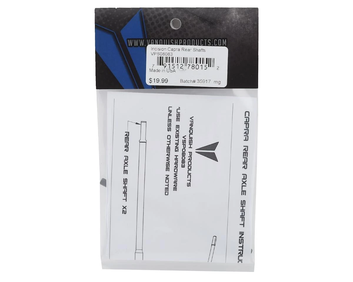 The Vanquish Axial Capra Rear Axle Shafts are a chromoly rear axle shaft option for the Axial Capra Currie F9 Portal Axles. Package includes two axles and bearings.Â