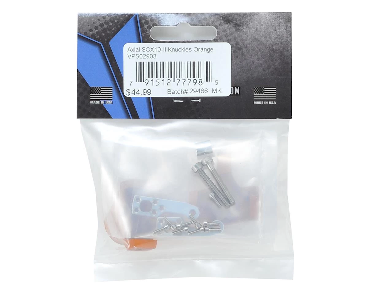 The Vanquish Products Axial SCX10 II Steering Knuckles are fully compatible with the stock link geometry and deliver a scale appearance, with a double shear support arm for durability.