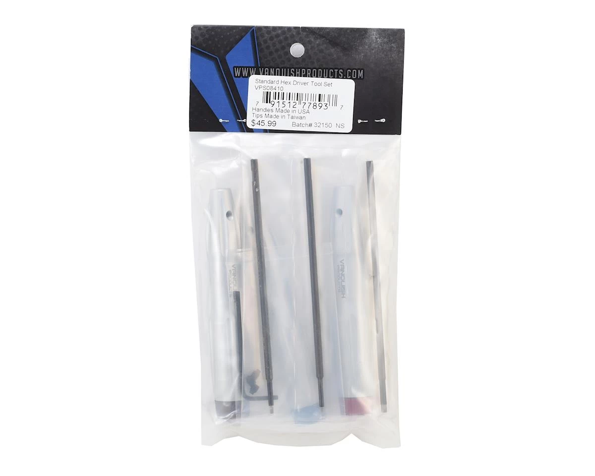 The Vanquish Products Standard Tool Set features machined aluminum handles with a bearing supported cap for comfort while working. Each cap is anodized a different color for quick visual identification. The tool tips are laser etched with the Vanquish Products logo and tool tip size.