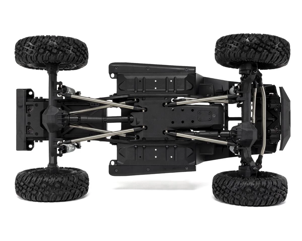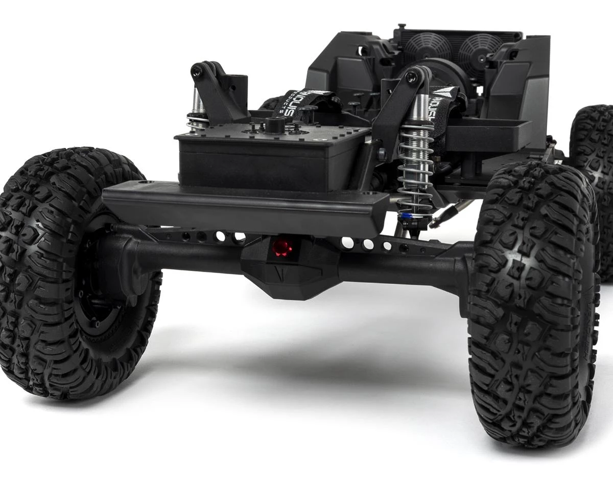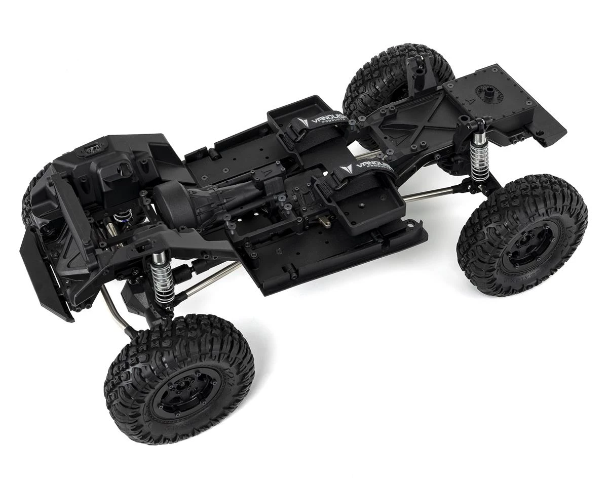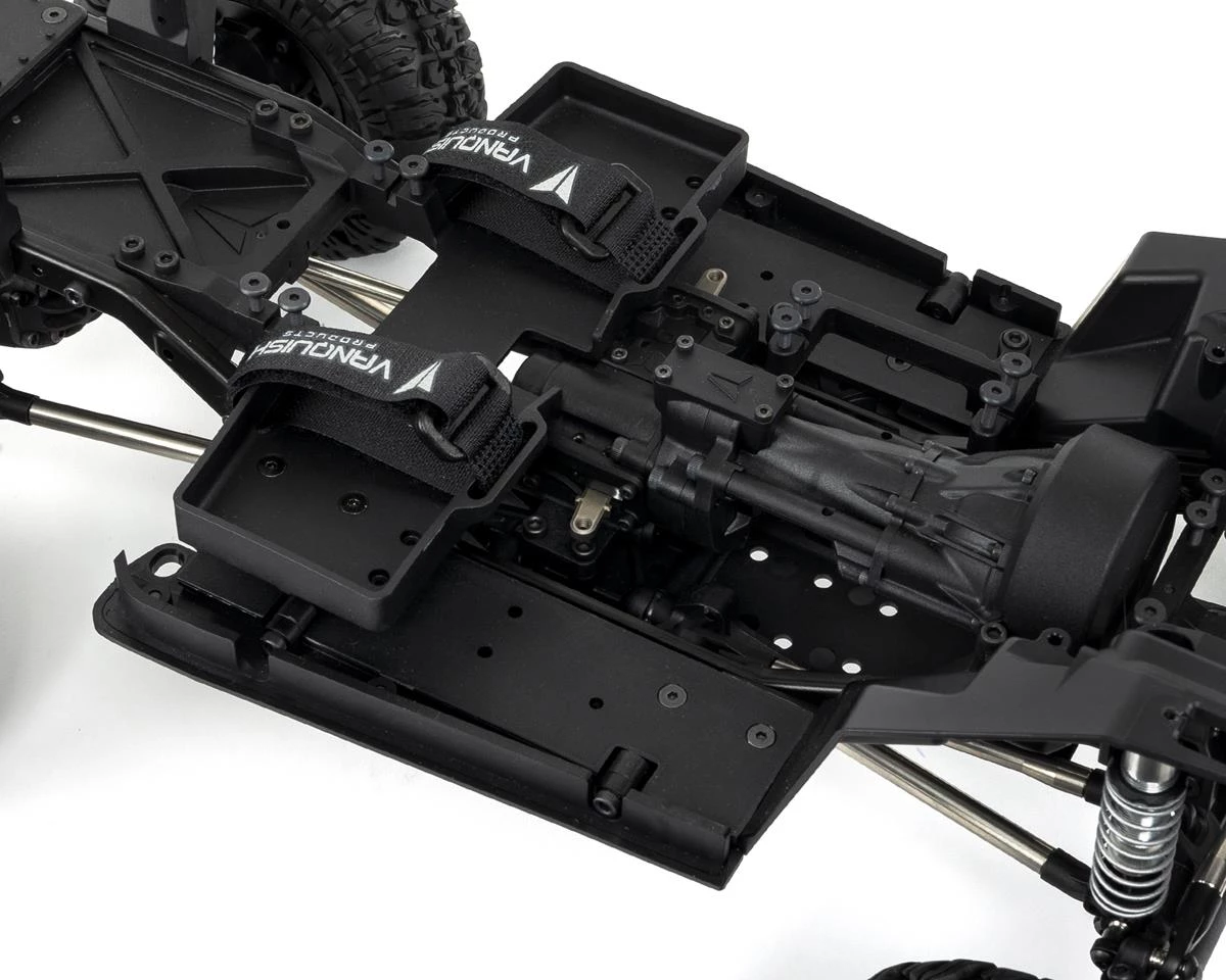 Vanquish Products VS4-10 Chassis is made to provide you with a balance of scale looks and unhindered performance. The steel C-channel design provides scale detail, molded front and rear cross members fill the chassis rails in the highest stress locations for ultimate strength and provide features like dual servo mounts, winch line routing, and a fuel cell. The molded rock sliders come with a replaceable tapered outer portion that perfectly fits the Phoenix body. The VS4-10 chassis is developed to work with the VFD Twin transmission to keep the overdrive and dig servo low on the platform. The panhard mount on the chassis is made from machined aluminum to withstand the impacts of severe trail conditions. Molded shock towers capture the top of the 80mm Incision S8E Shocks in double shear for maximum support. Narrow molded front and rear bumpers maximize clearances while improving approach and departure angles.