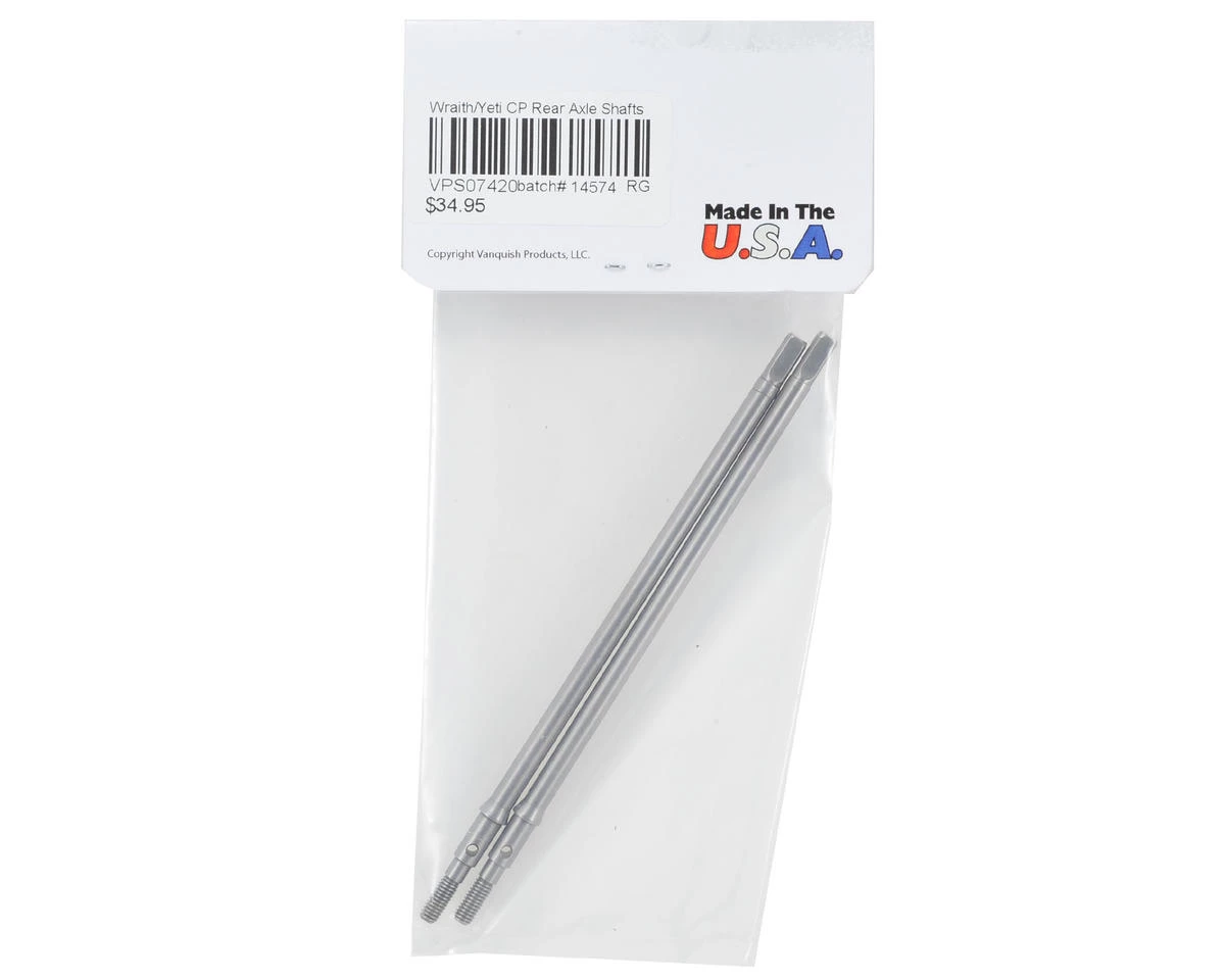 This is a pack of two replacement Vanquish Products Centered Pumpkin Rear Axle Shafts, intended for use with the Axial Wraith and Yeti when equipped with the optional Vanquish Centered Pumpkin Rear Currie Axle Set (VPS07400).