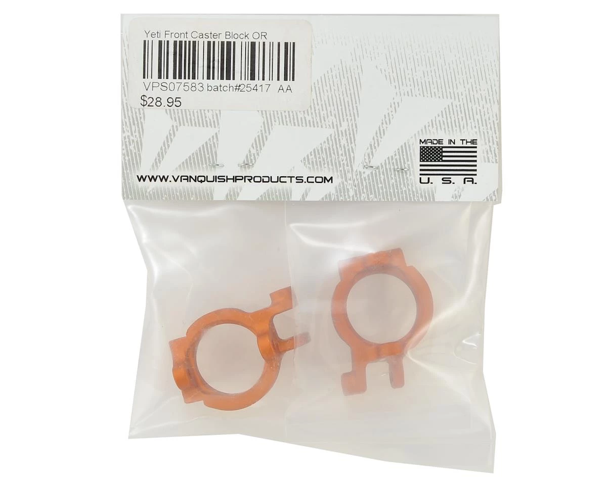 This is an optional Vanquish Yeti Front Castor Block Set. These aluminum front caster blocks are much stronger than the stock parts and are a direct fit upgrade for your Yeti rig.